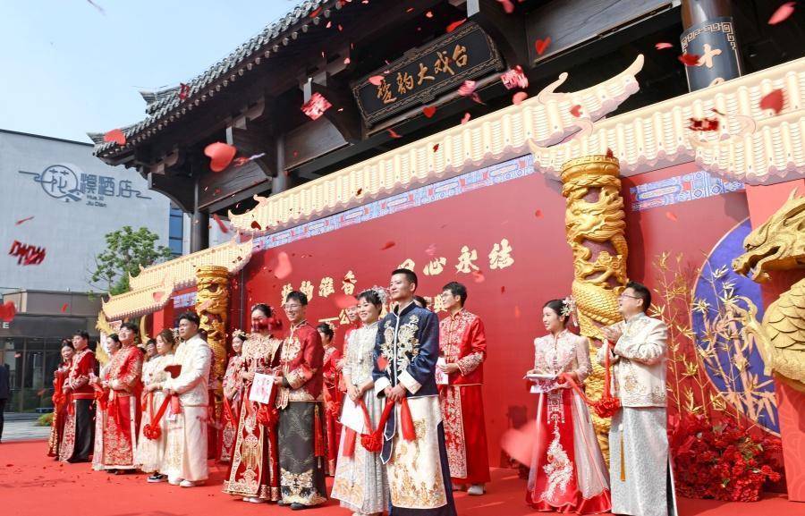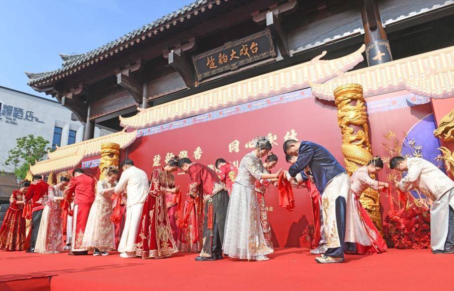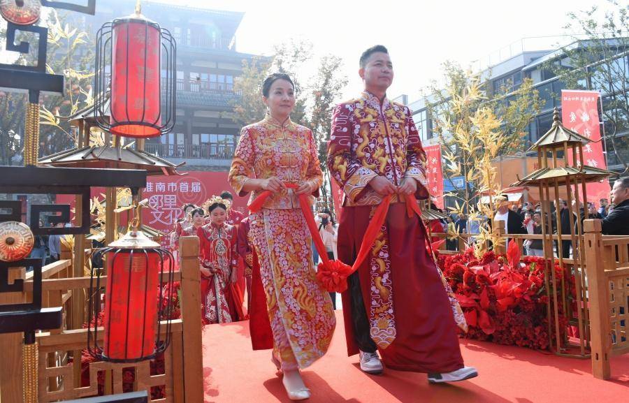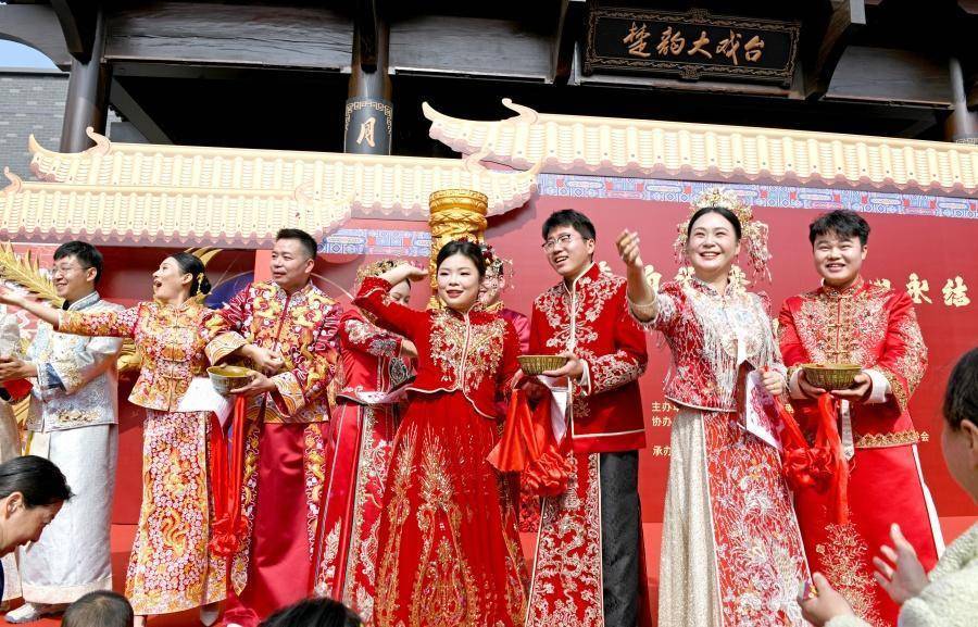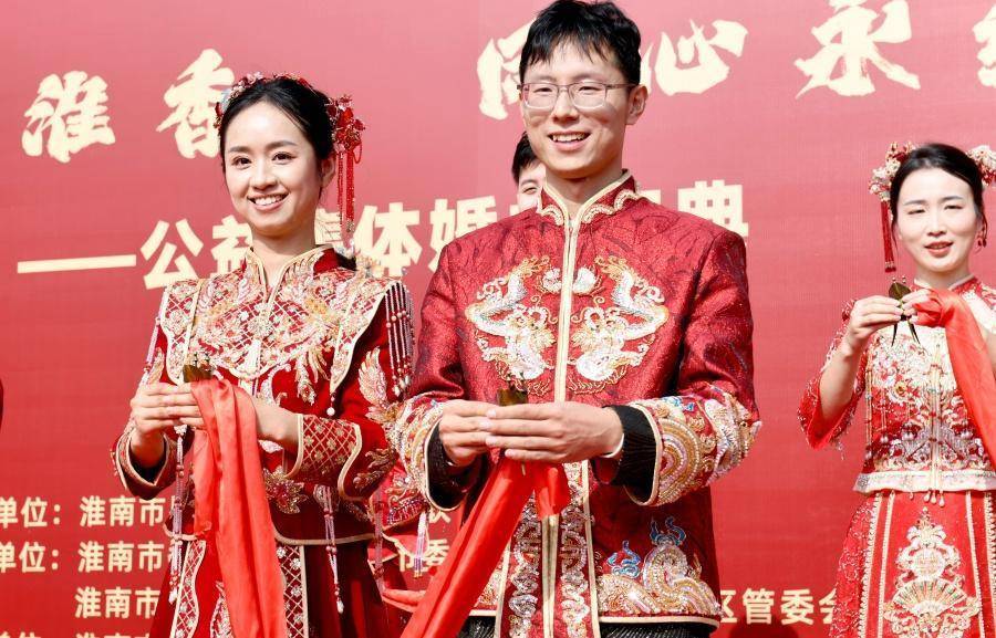 2025年11月1日,安徽省淮南市参加公益集体婚礼的新人展示非遗传承人现场创作的《双凤戏牡丹喜》作品。当日,安徽省淮南市首届邻里文化周专题活动——“楚韵淮香 同心永结”公益集体婚礼举行,新人们通过集体婚礼倡导移风易俗,推动婚事新办简办。(陈彬 文/图)